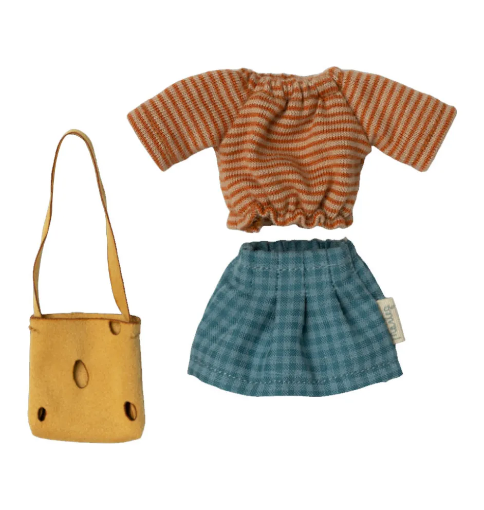 Bekleidungsset mit Käsebeutel von Maileg für Mutter Maus. Die Kleidung ist in einem Karton verpackt.