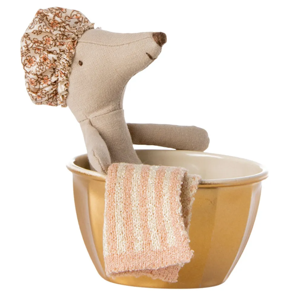 Das Set besteht aus einer Big Sister-Maus, einer goldenen Metallbadewanne, einer Badekappe und einem Handtuch.