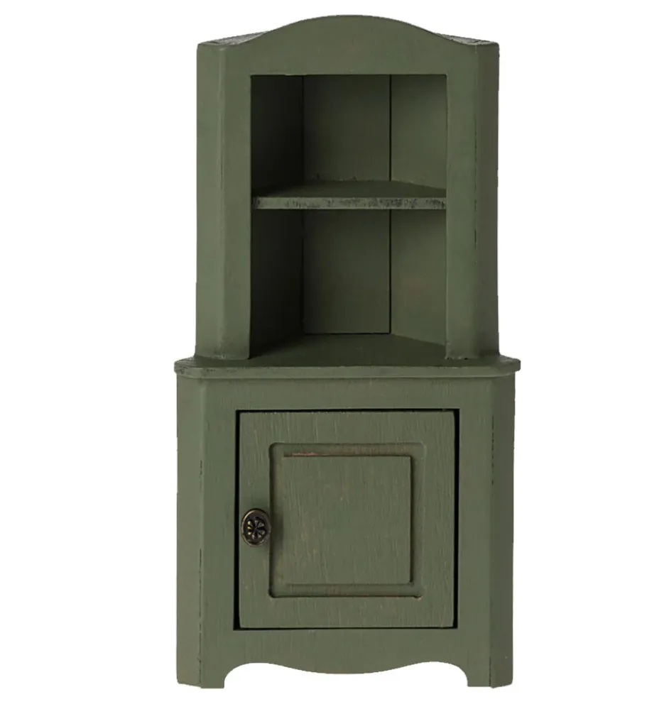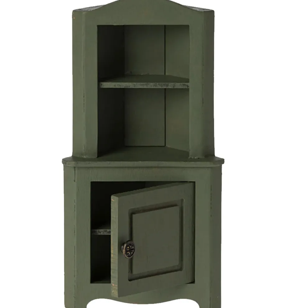 Grüner Schrank für die Maileg-Mäuse. Es ist ein Eckschrank.