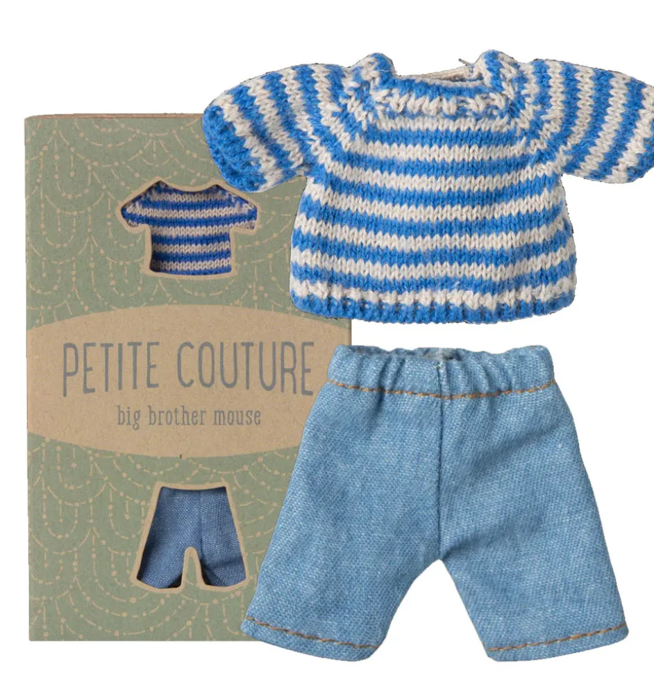 Maileg Petite Couture-Kleidungsset für Big Brother-Mäuse. Das Set besteht aus einer Hose/Jeans und einem Ringelpullover. Die Kleidung ist in einem schönen Karton verpackt.