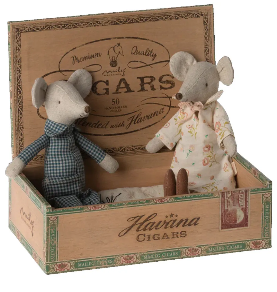 Maileg Opa und Oma Maus in einer Zigarrenschachtel