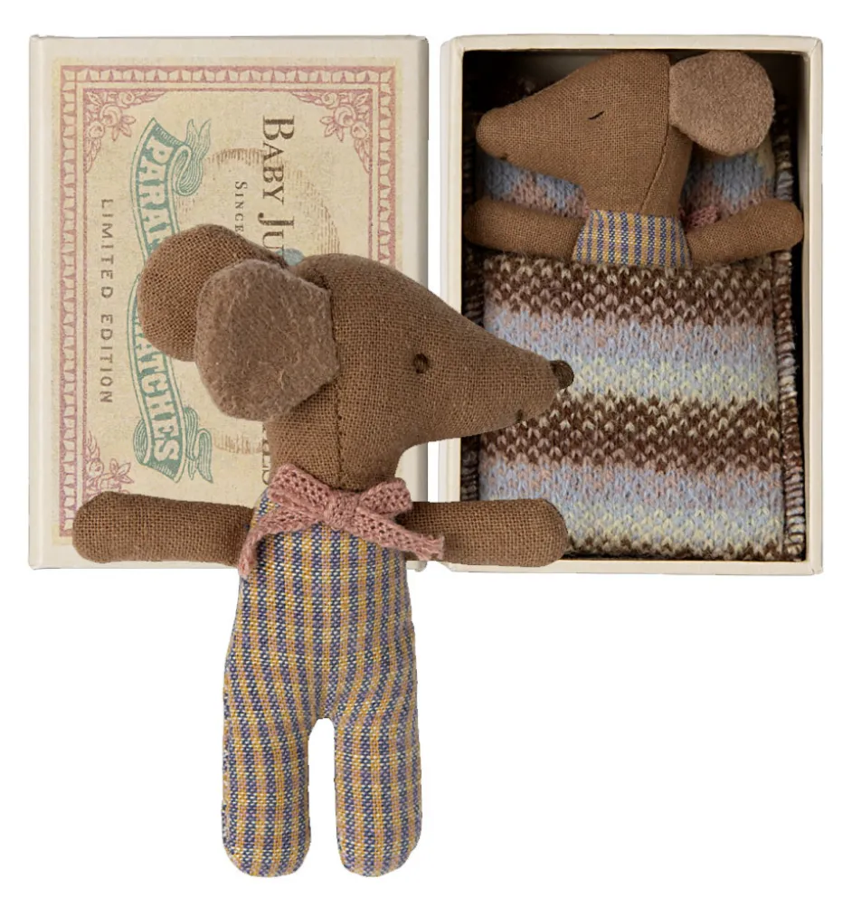 Süße Babymaus von Maileg in einer Box. Auf der einen Seite hat sie ein schlafendes Auge und auf der anderen Seite hat sie ein waches Auge. Die Maus kommt in Form einer schönen Schachtel zu ihrem Bett. Inklusive Bettwäsche.