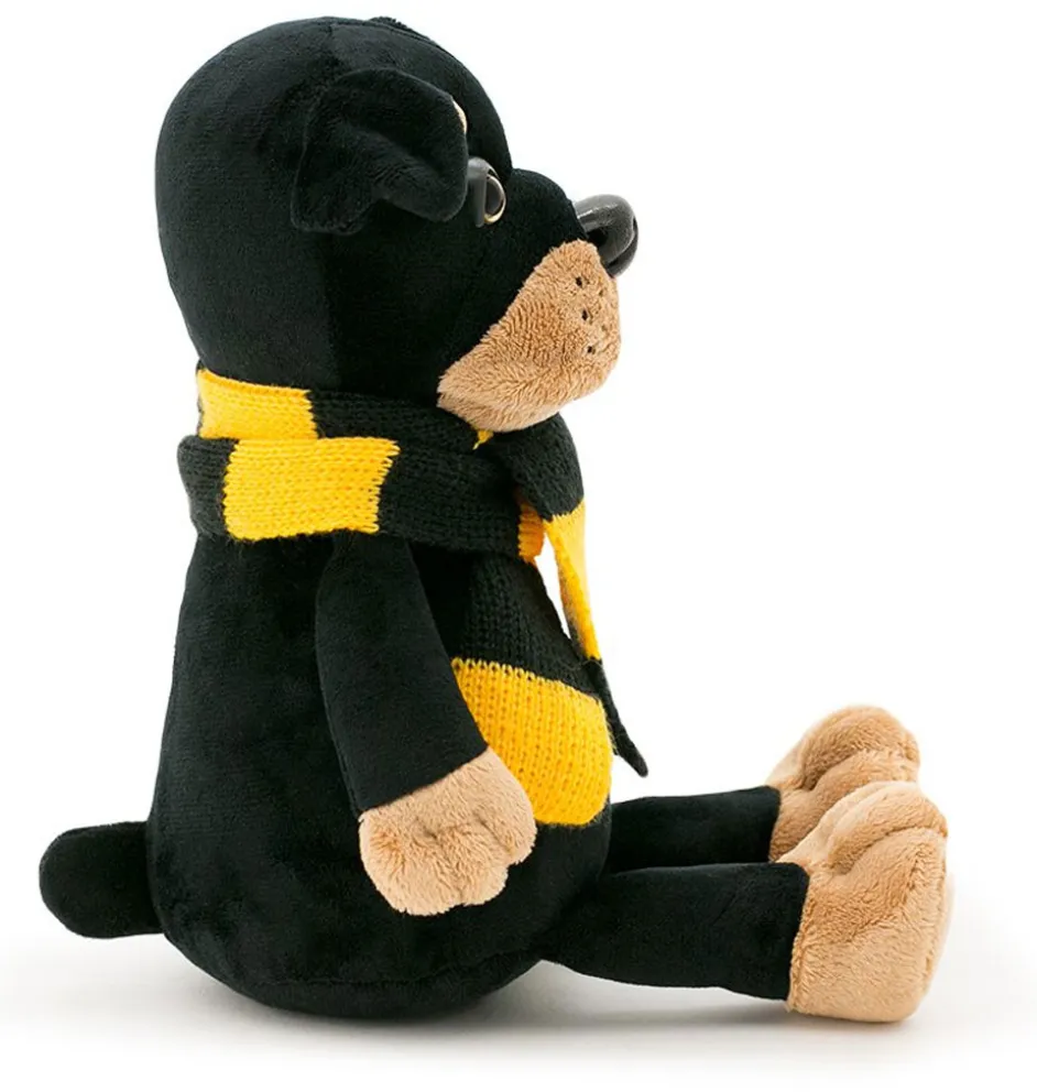 Kuschelhund Bax ist ein Rottweiler, ein robuster, treuer Kuschelfreund der Marke Orange Toys aus Lettland. Er mag die Kälte nicht besonders, daher der Schal. Ein schönes Detail ist seine glänzende Nase.