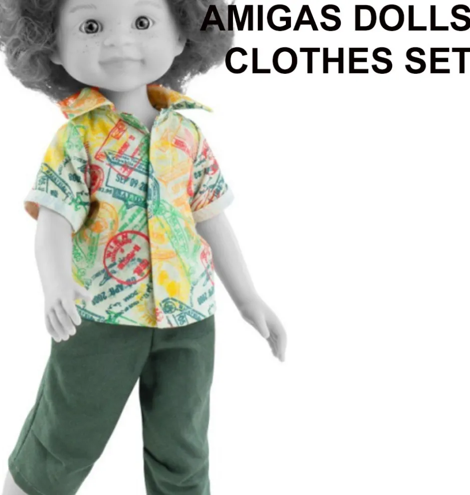 Das Set besteht aus einem bedruckten Hemd und einer Hose. Lässt sich gut mit anderen Amigas-Kleidungsstücken kombinieren, die wir in unserem Geschäft verkaufen. Sie haben noch keine Amigas-Puppe? Die verkaufen wir auch.