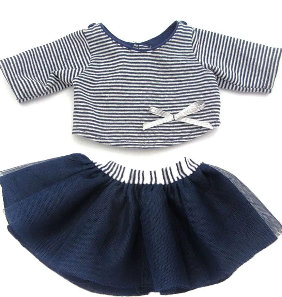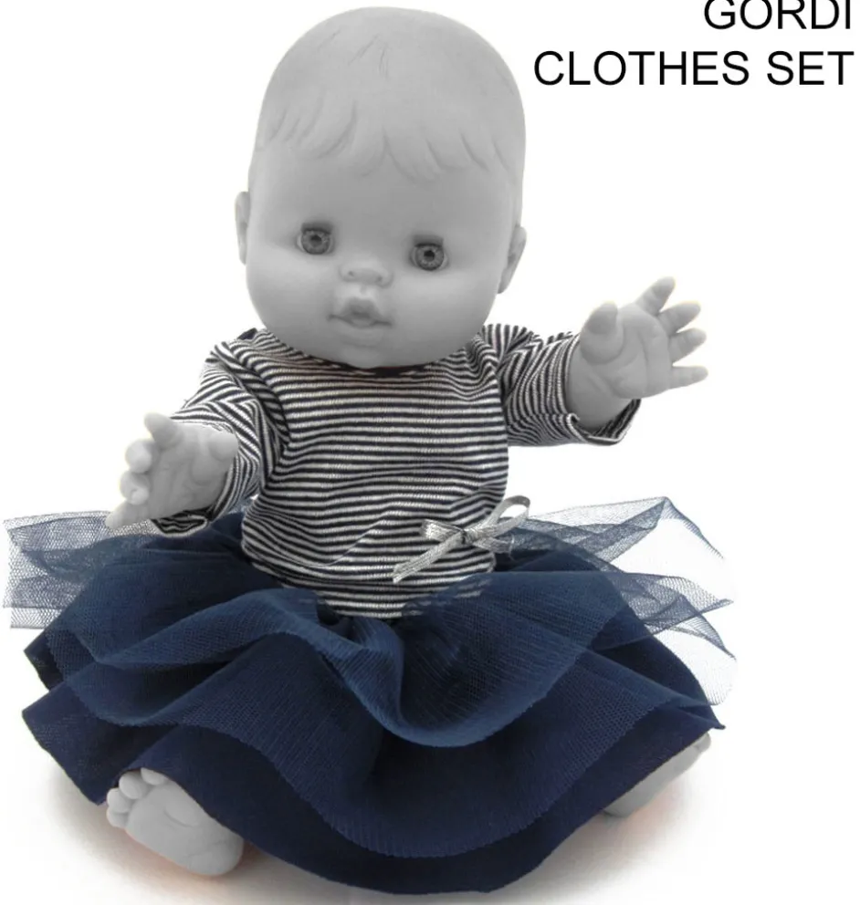 Zweiteiliges Bekleidungsset von Paola Reina, speziell für die Gordi-Puppen entworfen. Das Set besteht aus einem gestreiften bretonischen T-Shirt und einem passenden Rock mit Tüll.