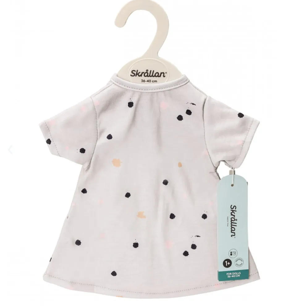 Graues Puppenkleid mit Punkten der schwedischen Marke Skrållan. Entworfen für Puppen von 36 bis 40 cm. Die Miniland-Puppen von 38 cm und die Stehpuppen von Minikane können dieses Kleid tragen. Bei den Gordi-Puppen fällt das Kleid bis zu den Knöcheln.