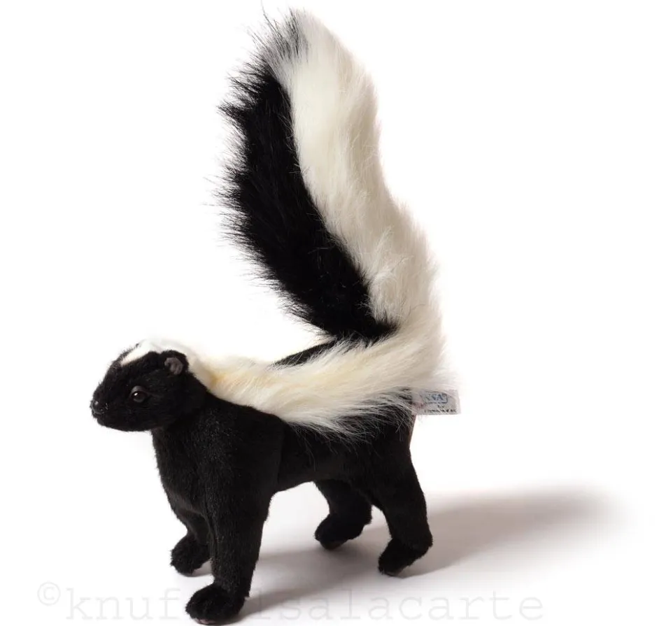 Wunderschönes Stinktier-Kuscheltier von Hansa aus Amerika. Dieses Kuscheltier ist 34 cm groß, gemessen vom Kopf bis zum Schwanz. Die Beine sind biegbar und es sieht fast echt aus. Hansa stellt handgefertigte Kuscheltiere von sehr hoher Qualität her. Die Kuscheltiere erfreuen sich großer Beliebtheit bei Jung und Alt und werden auch gerne von Sammlern erworben. Man kann mit ihnen schön kuscheln, aber sie bieten auch wunderbar einen schönen Platz.