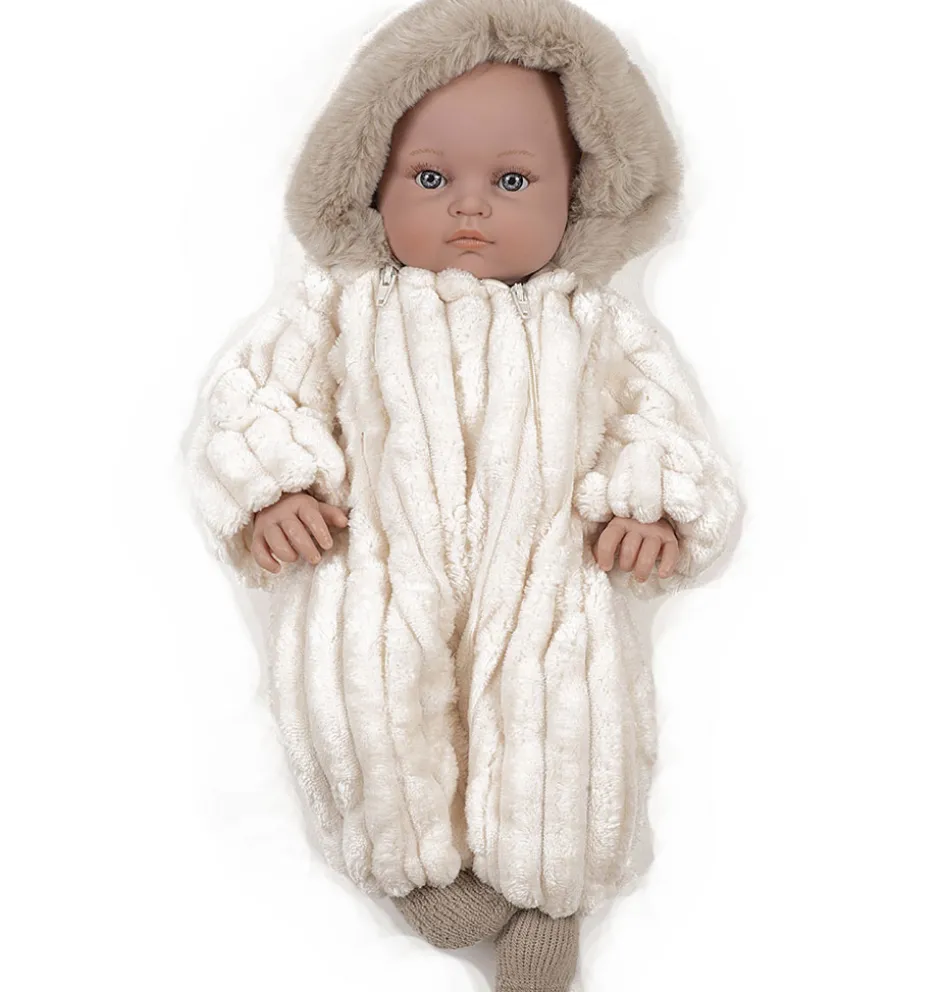 Carlota-Pilotenanzug aus Minky-Samt mit Kapuze und Kunstpelz für Minikane Bambinis-Puppen von 47 cm.