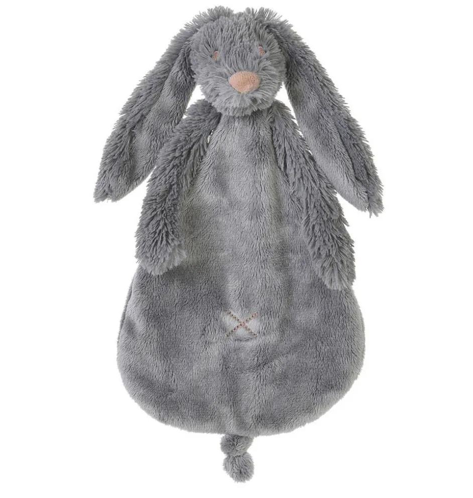 Weiches Kuscheltuch in Form eines grauen Kuschelhasen. Hergestellt von Happy Horse. Sehr gut geeignet als Mutterschaftsgeschenk. Das Tuch ist bei 30 Grad waschbar. Das Kuscheltuch ist 25 cm groß