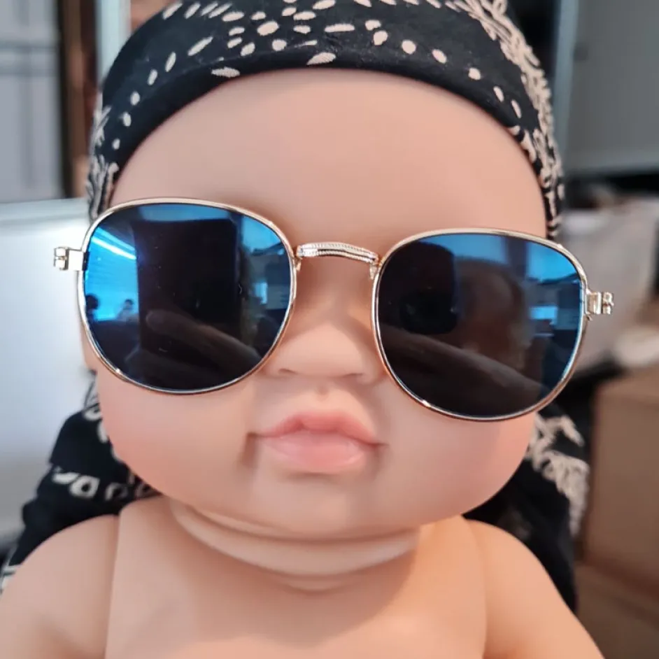 Coole Puppensonnenbrille der Marke Heless. Der Rahmen ist goldfarben und die Gläser sind reflektierend.