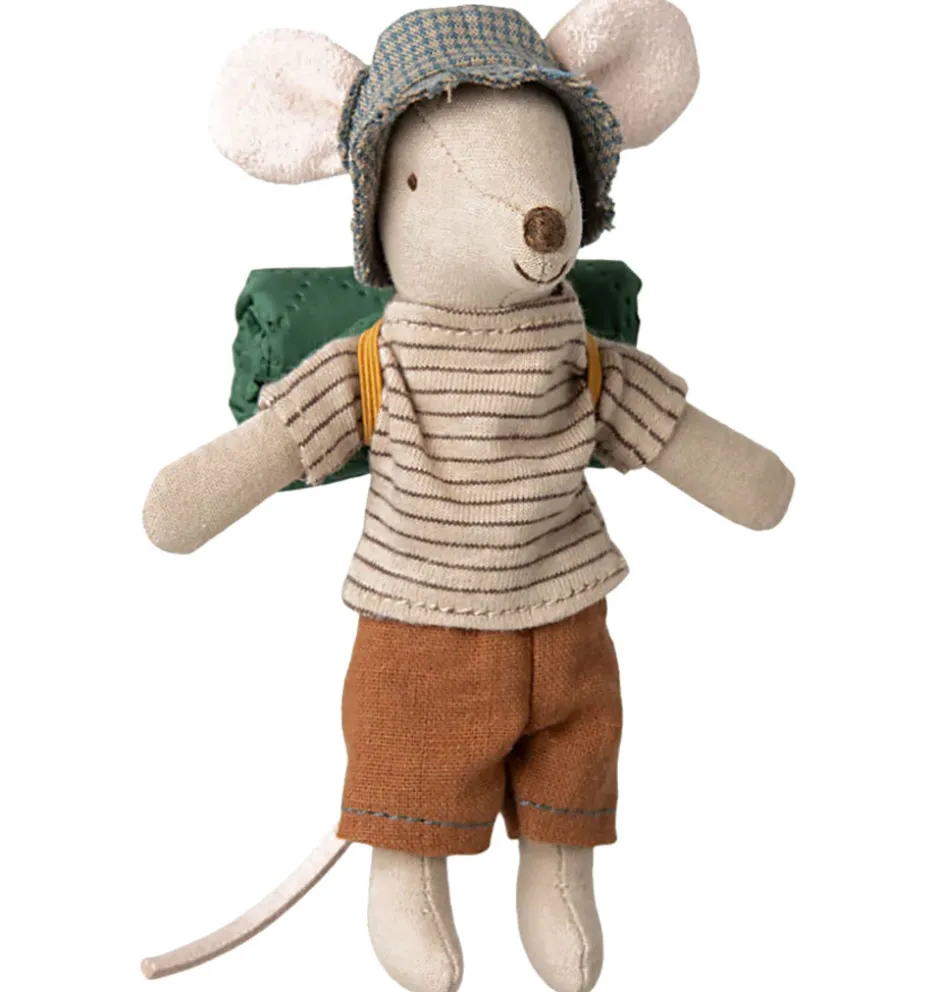 Maileg Hiker Maus Big Brother mit Schlafsack. Diese Maus hat Magnete in den Händen, sodass sie etwas festhalten kann. Die Maus hat ein trendiges Outfit und einen Schlafsack an.