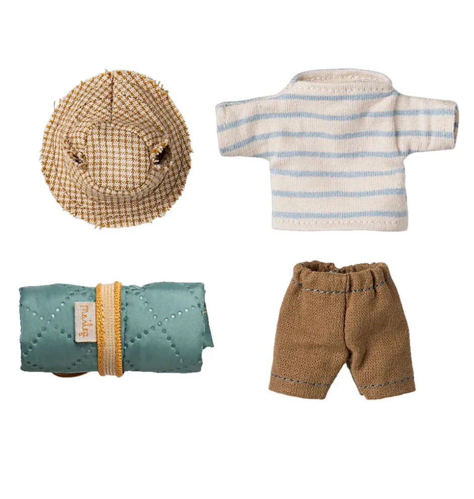 Maileg Hiker Maus Big Brother mit Schlafsack. Diese Maus hat Magnete in den Händen, sodass sie etwas festhalten kann. Die Maus hat ein trendiges Outfit und einen Schlafsack an.