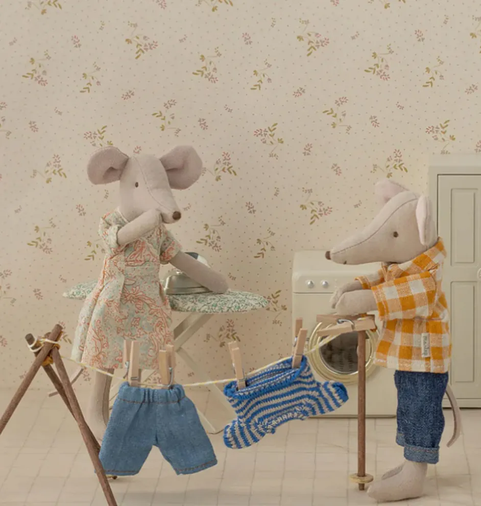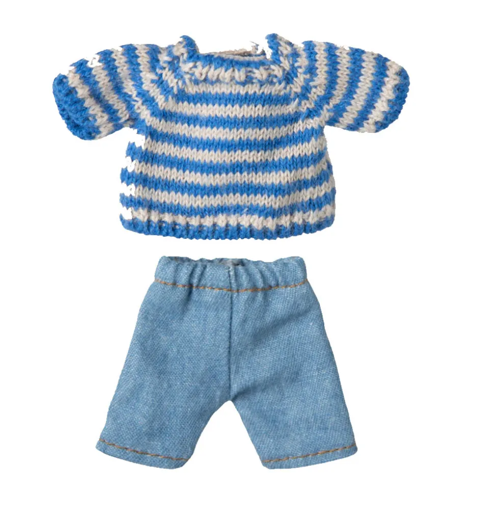 Maileg Petite Couture-Kleidungsset für Big Brother-Mäuse. Das Set besteht aus einer Hose/Jeans und einem Ringelpullover. Die Kleidung ist in einem schönen Karton verpackt.