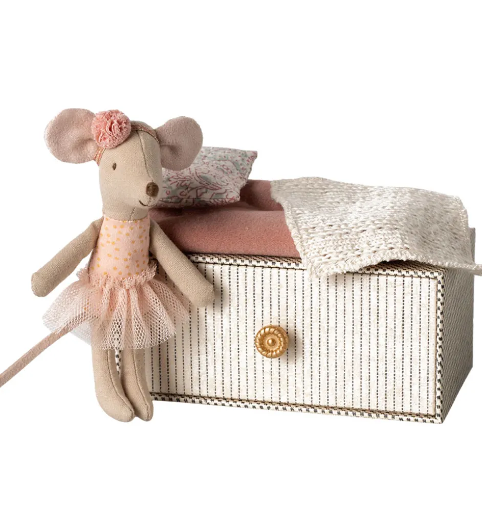 Das ist Little Miss Mouse, eine Maileg Little Sister-Maus in ihrem Tagesbett mit Bettwäsche.
