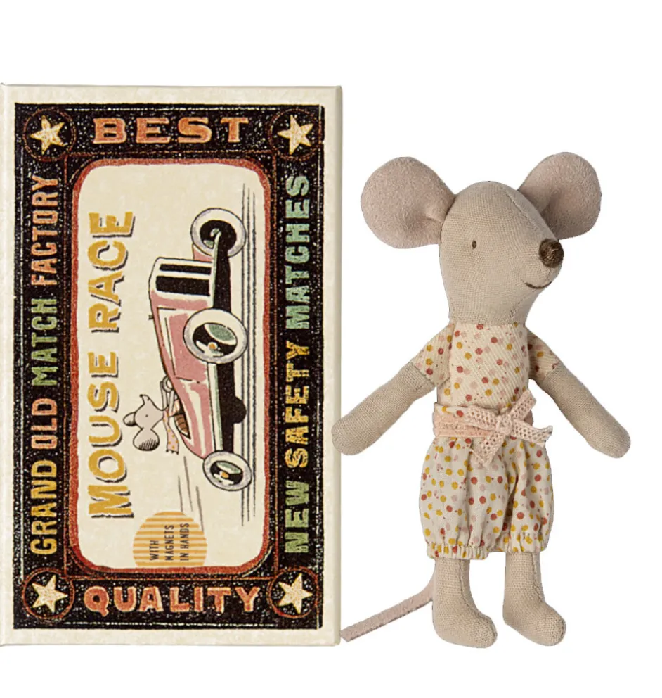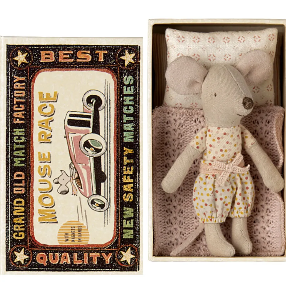 Maileg Little Sister Maus in Streichholzschachtel mit Bettwäsche der dänischen Marke Maileg.