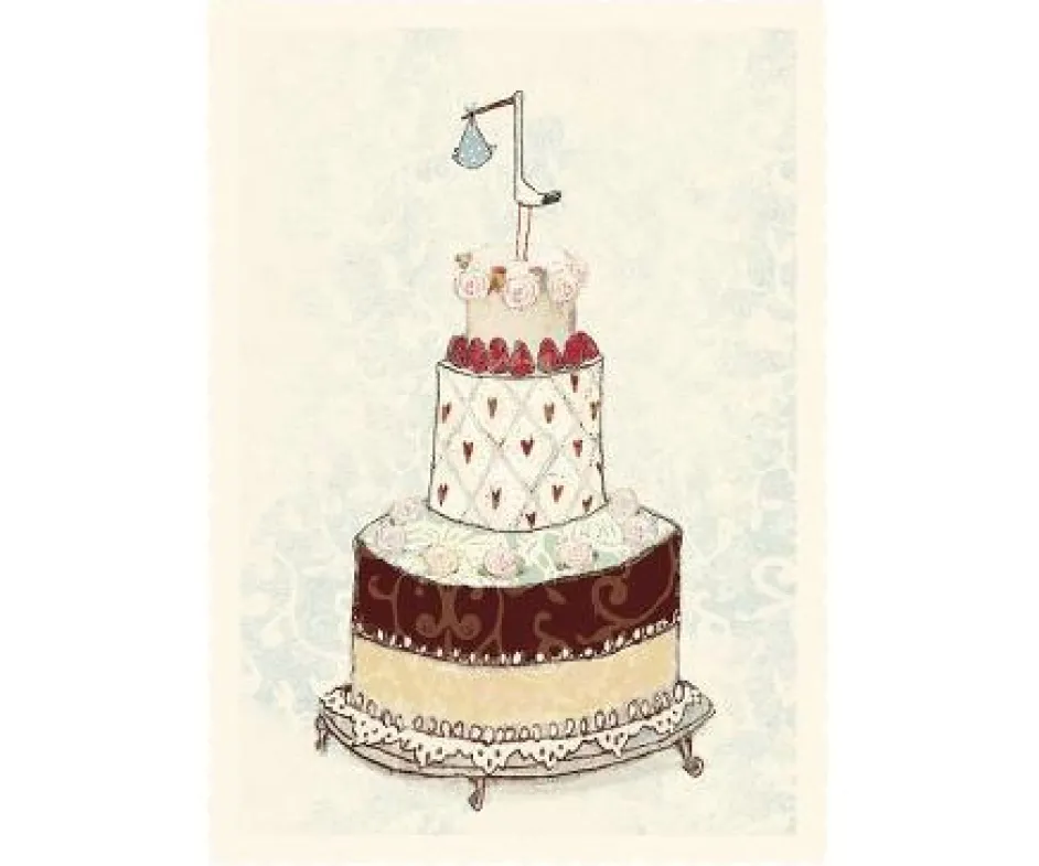 Maileg-Karte mit einem Bild eines Storchs. Wir können keinen Glückwunschdruck direkt auf diese Karte drucken, aber wir können ein gedrucktes Etikett darauf kleben.
