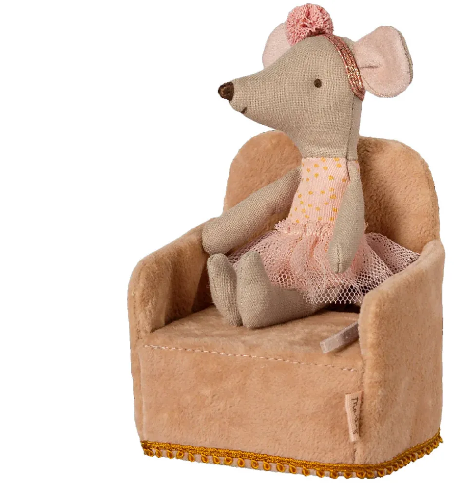 Dieser schöne Entspannungsstuhl ist maßgeschneidert für die Maileg-Mäuse. Perfekt für das Wohnzimmer Ihres Mäusehauses. Der Stuhl wird flach verpackt geliefert und lässt sich leicht zusammenbauen.