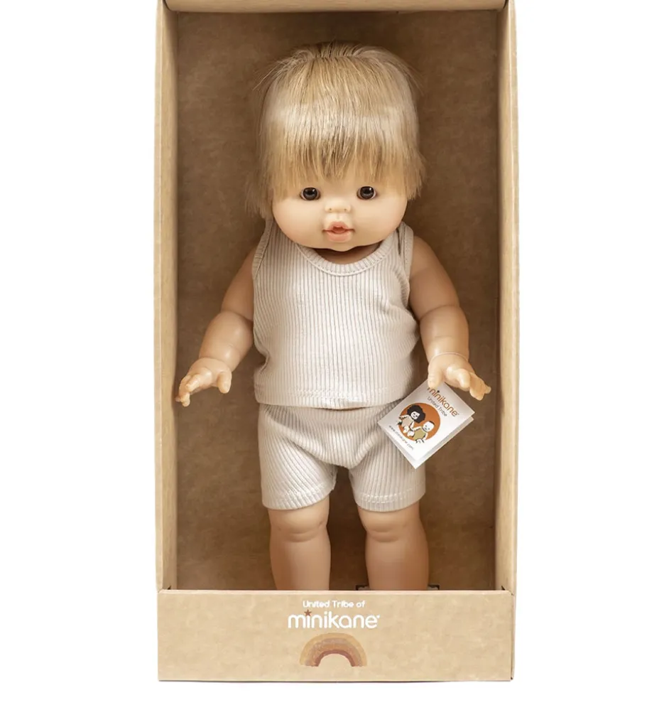 Dies ist Archie, eine stehende Gordi-Puppe von Minikane, die in Zusammenarbeit mit der spanischen Marke Paola Reina entworfen wurde. Archie ist 37 cm groß und trägt ein Unterwäscheset von Minikane. Er kann selbstständig aufrecht stehen und ist etwas größer als die Gordi-(Baby-)Puppen. Wie alle Gordi-Puppen hat Archie einen dezenten Vanilleduft. Es wird in einer Minikane-Verpackung geliefert.