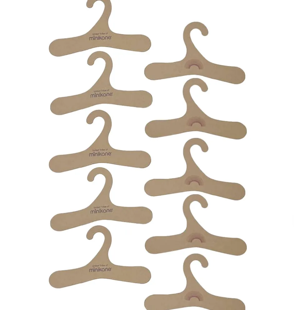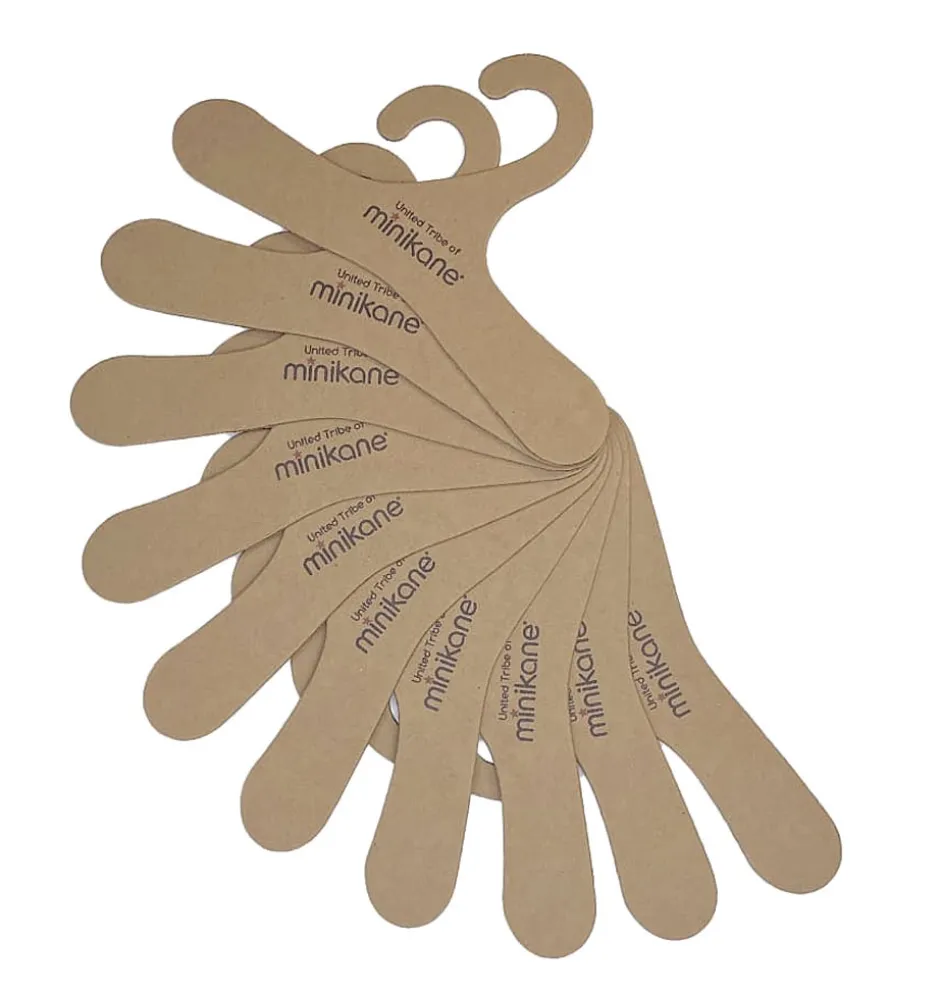 Zehn Kleiderbügel aus Pappe von Minikane. Das Logo ist darauf aufgedruckt.