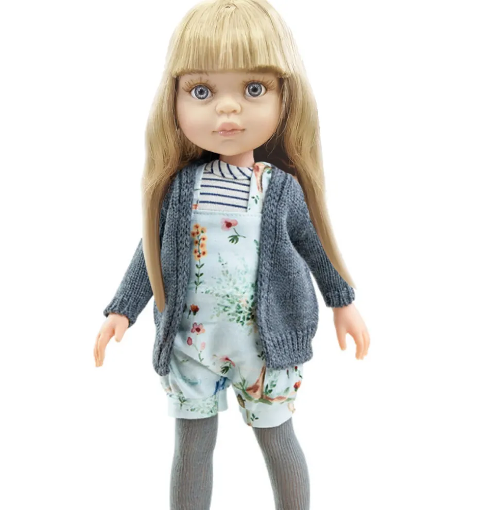 Eine warme Strickjacke, eine bedruckte Latzhose, ein Pullover und Strumpfhosen für Ihre Amigas-Puppe!