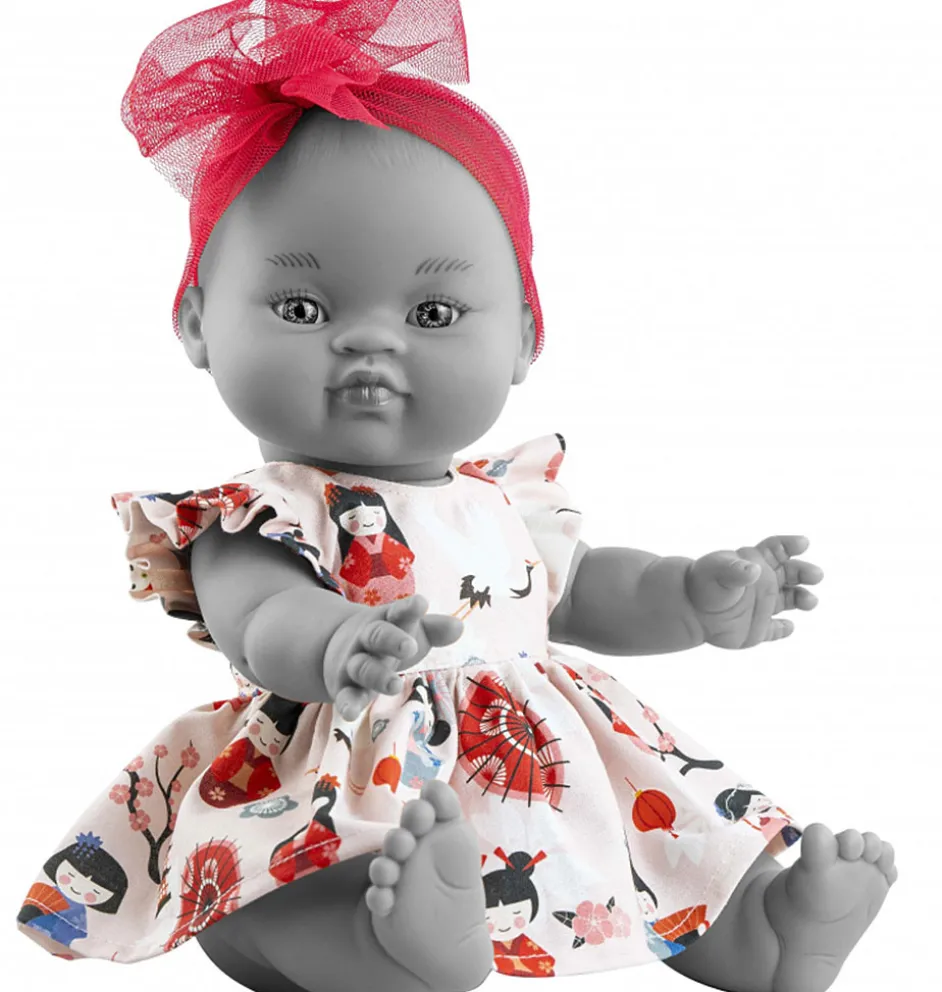 Die Kleidung wird in Spanien hergestellt und besteht aus einem Kleid mit japanischem Aufdruck und einem Stirnband.