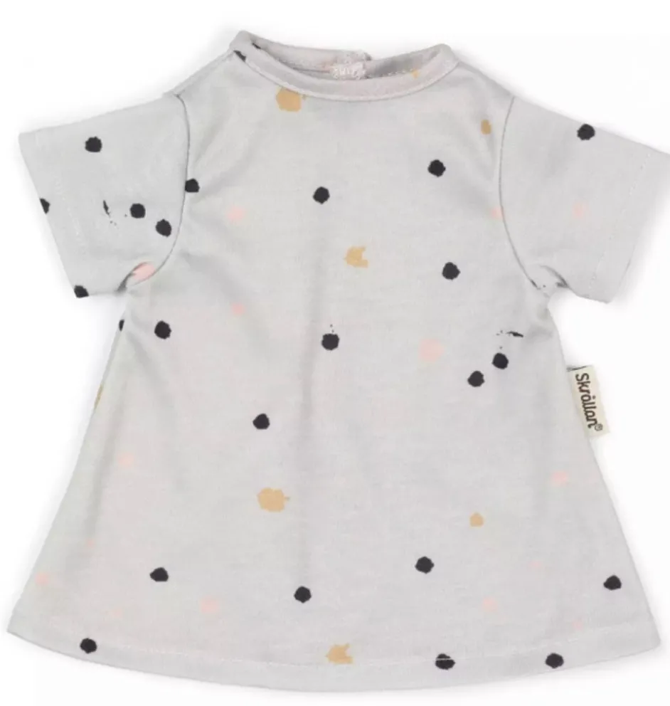Graues Puppenkleid mit Punkten der schwedischen Marke Skrållan. Entworfen für Puppen von 36 bis 40 cm. Die Miniland-Puppen von 38 cm und die Stehpuppen von Minikane können dieses Kleid tragen. Bei den Gordi-Puppen fällt das Kleid bis zu den Knöcheln.